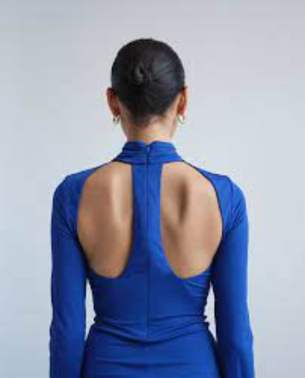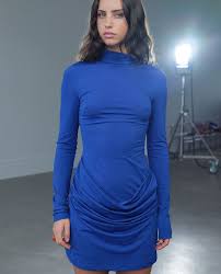 The Veda Mini Dress features long sleeves and a high neckline with back zip closure. Cut from a crepe finish jersey, the cut out racer back detail extends into a high collar neckline. The front skirt features our signature waist cowl detail.